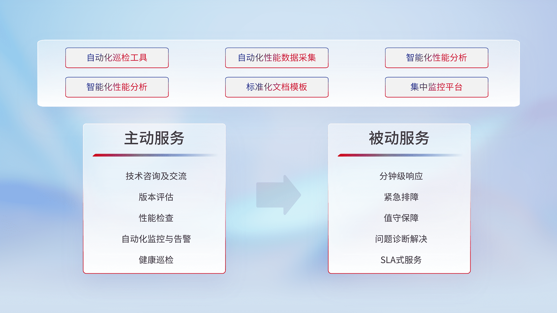智能化工具和标准化文档,,,,保障服务质量,,提供主动服务(包含技术咨询、、、版本评估、、性能检查、、、、自动化监控与告警、、、健康巡检)和被动服务包含(分钟级响应、、紧急排障、、、、值守保障、、、问题诊断解决、、SLA服务)。。